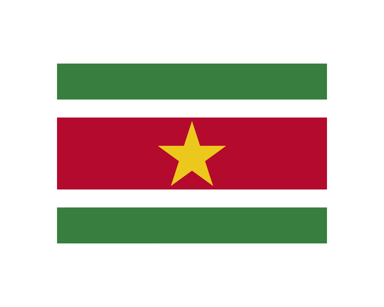 蘇里南共和國(The Republic of Suriname),簡稱蘇里南(蘇里南語:Sranan;博杰普爾語:Sarnam)。位于南美洲北部,是南美洲國家聯盟成員國,首都帕拉馬里博為蘇里南河河口的商港。蘇里南國旗采用于1975年11月25日,呈長方形,長與寬之比為3:2。旗面自上而下由綠、白、紅、白、綠五個平行長條組成,紅、綠、白條的寬度之比為4:2:1。旗面中央有一顆黃色五角星,象征民族的團結和光明的前途;綠色代表豐富的自然資源和肥沃的土地,也象征人民對新蘇里南的期望;白色象征正義和自由;紅色象征熱情和進步,也表示為祖國獻出全部力量的愿望。