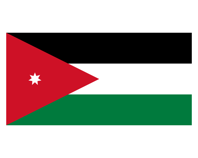 約旦哈希姆王國(The Hashemite Kingdom of Jordan),簡稱約旦(Jordan),位于亞洲西部,約旦國旗呈長方形,長與寬之比為2∶1??科鞐U一側為紅色等腰三角形,內有一顆白色七角星;右側自上而下為黑、白、綠三色的平行寬條。以上四種顏色為泛阿拉伯色,白色七角星象征古蘭經。約旦國旗和巴勒斯坦國旗很相似,唯一不同是約旦國旗在紅色三角形上多一個白色七角星。