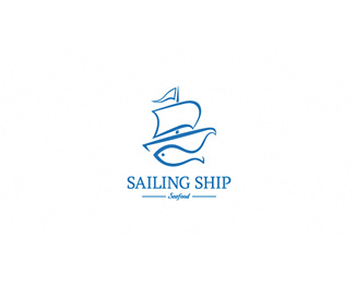 SAILINGSHIP海鮮公司標志,以線條的方式融入帆船和魚的元素構成該公司的識別圖形,藍色是識別色。